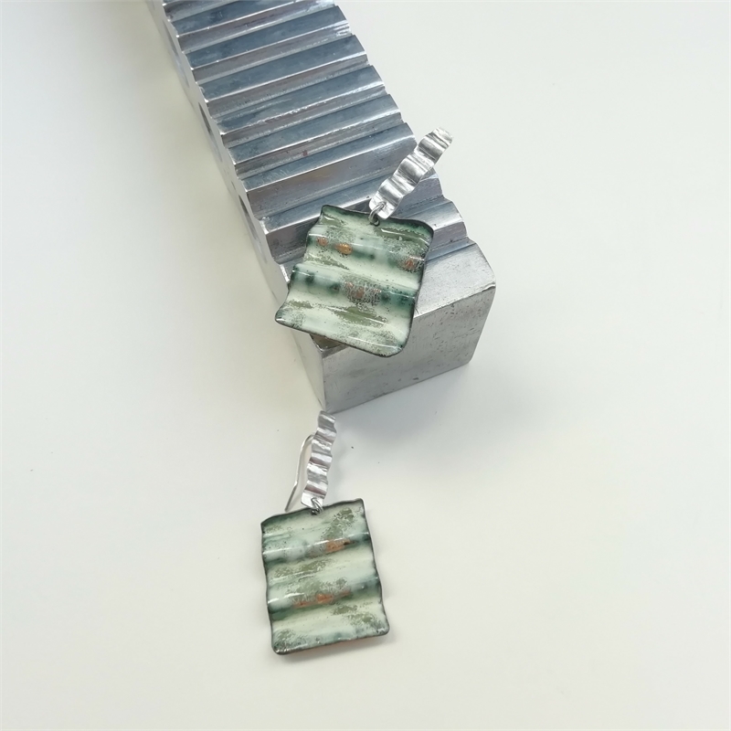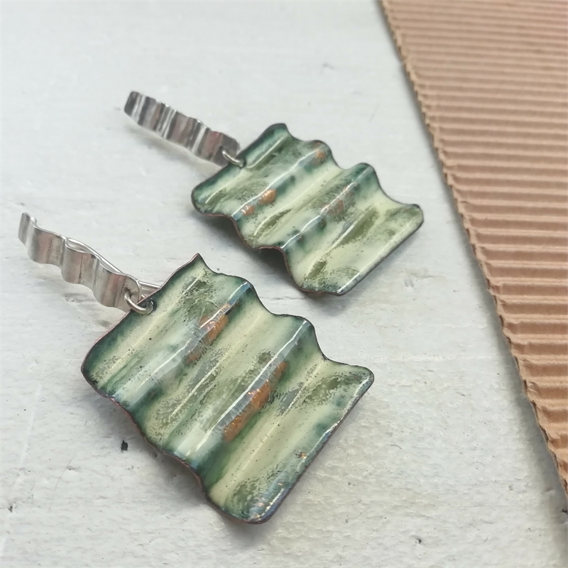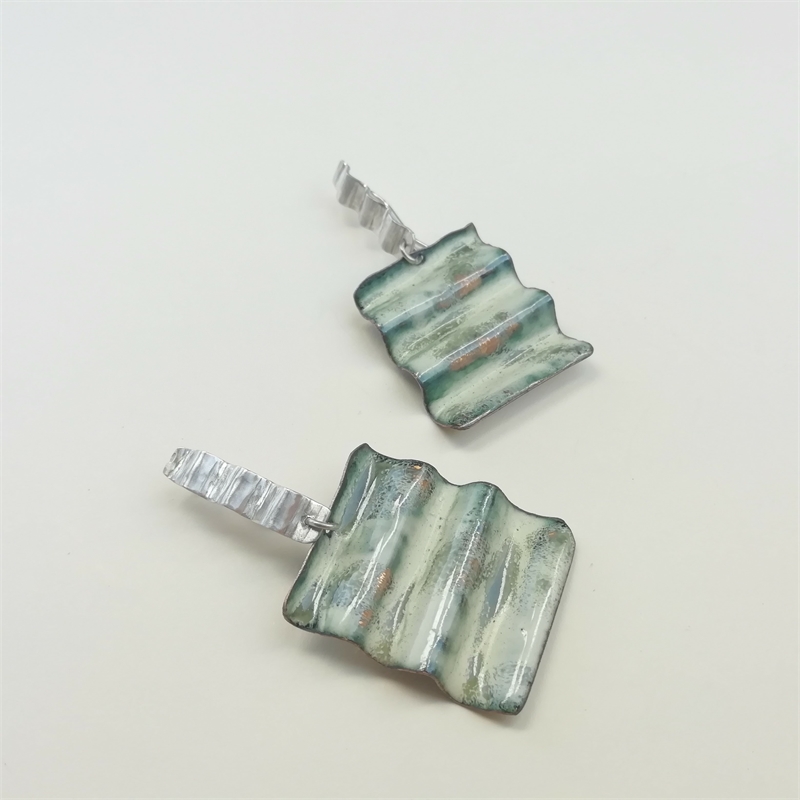 Pendientes de diseño original y rústico con parte superior de plata conformada y gancho rígido. Parte colgante también conformada de igual manera y esmaltada en tono marfil con tonos verdes y cobrizos.