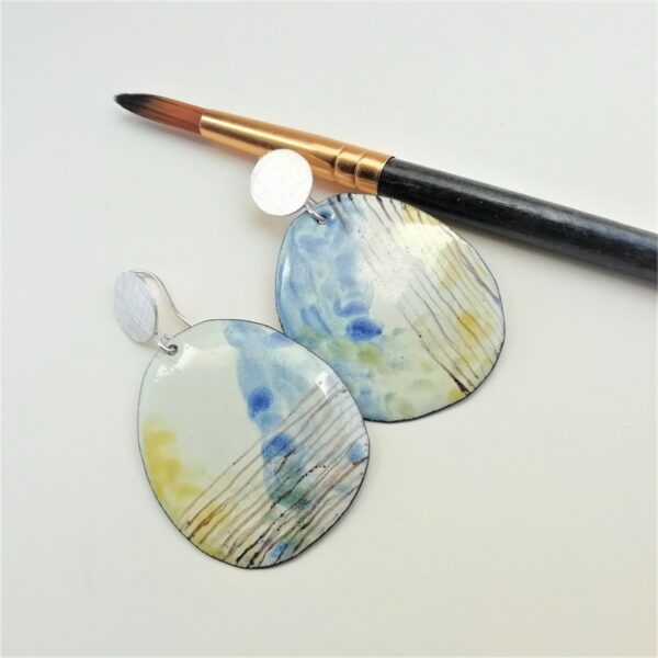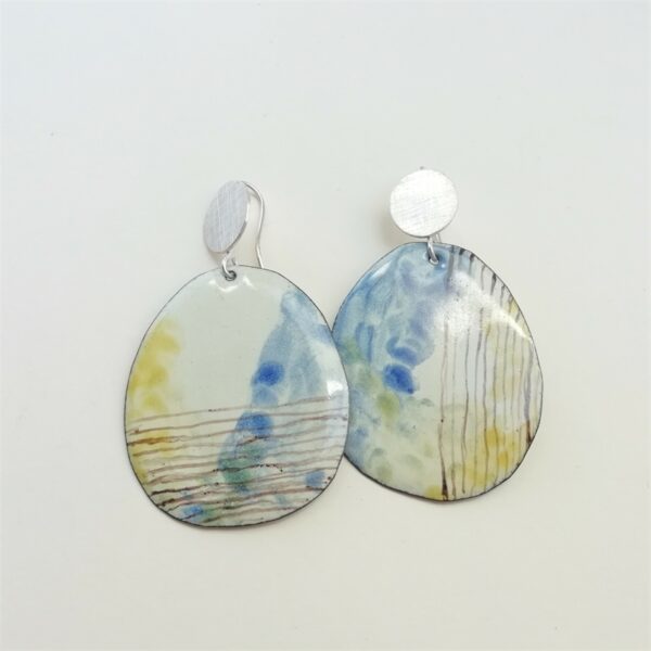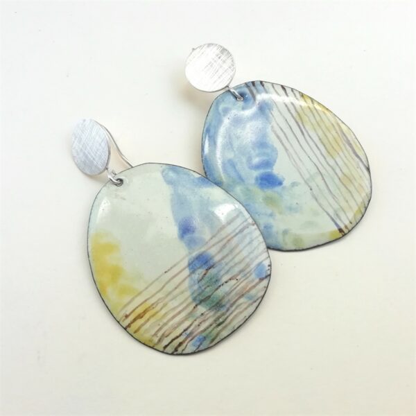 Pendientes de tamaño medio con gancho rígido en la plata de textura rayada. La parte colgante con movimiento esmaltada en tono marfil y manchas a la acuarela en tonos azul, amarillo ocre y marrón. Diseño asimétrico en su decoración posee finura y delicadeza.
