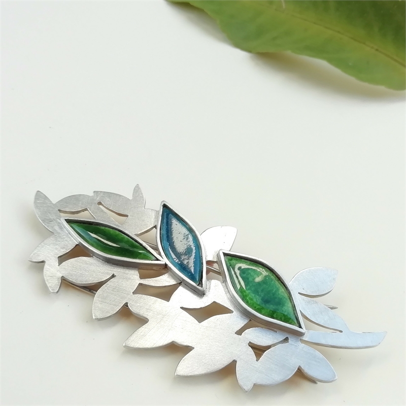 Broche de plata con esmaltes en colores verdes turquesa con textura rayada que aporta brillos y destellos muy elegantes. Inspirado en la sombra del limonero en la ventana posee una sutil delicadeza y forma parte de la colección “El árbol da la Vida”.
