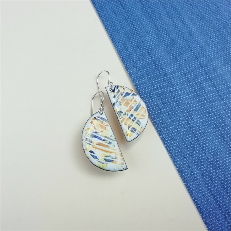 Pendientes de esmalte al fuego en tonos blanco, azul y amarillo. Forma de media esfera. Gancho de plata de Ley.