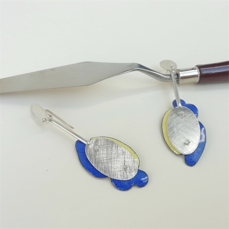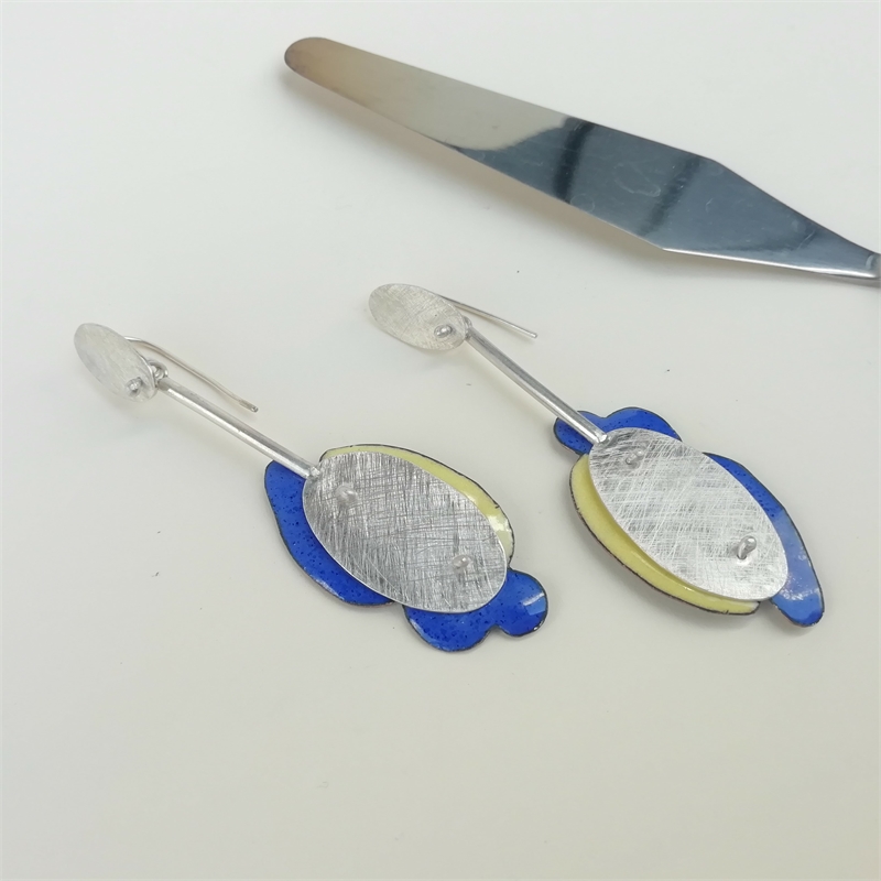 Pendientes con gran diseño consta de gancho rígido, plata con textura rayada y esmalte al fuego en tonos azul y amarillo. La parte colgante tiene movimiento aportando. Adornados en las conexiones con pequeños remaches que dan un aspecto moderno y actual. En su disposición de formas poseen una ligera asimetría para darle gracia y fluidez. Conjunto muy compacto y vistoso.