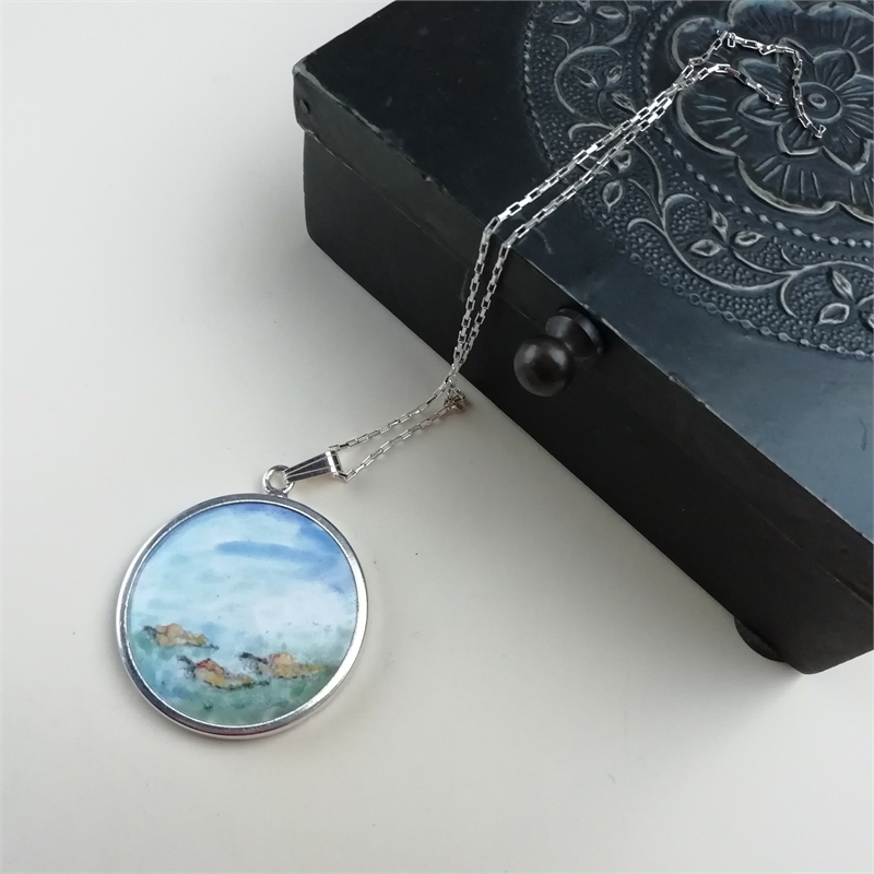 Colgante de esmalte al fuego montado sobre plata de Ley. La decoración es una acuarela. Cadena no incluida.