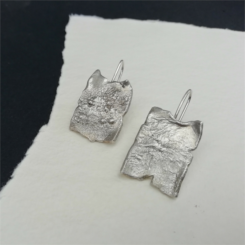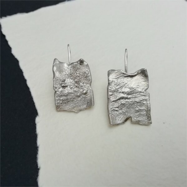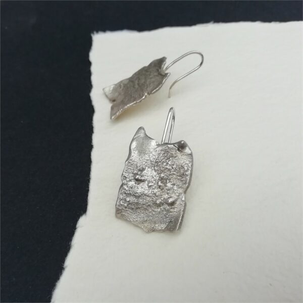 Pendientes con gancho rígido. Sencillos en su forma con textura rugosa y corte asimétrico.