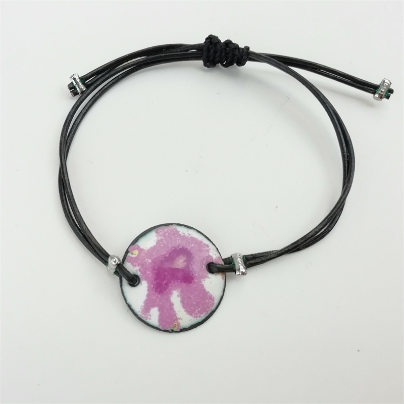 Pulsera de cuero finito muy juvenil para un detalle. El adorno es de esmalte al fuego colores blanco y rosas.