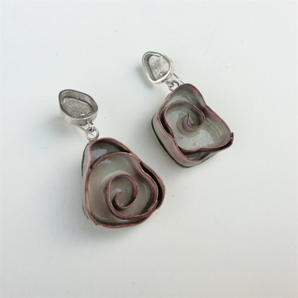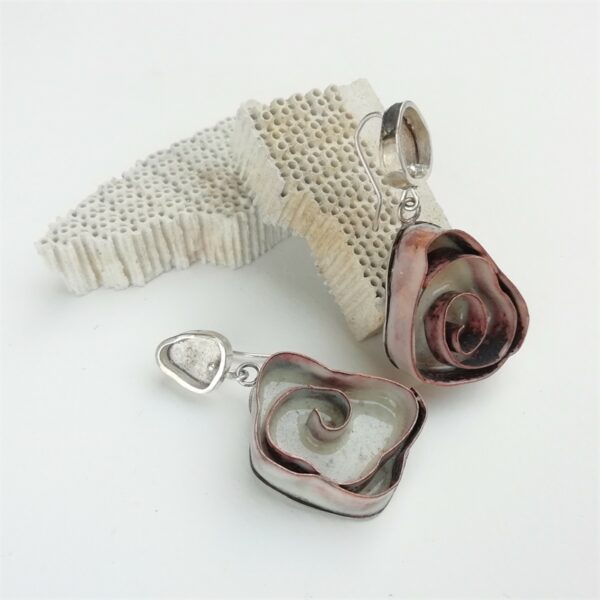 Pendientes con gancho rígido en la parte superior de plata de Ley. Colgante esmaltado en tono marfil con forma de espiral totalmente asimétricos. Diseño muy compacto con gran volumen y movilidad son versátiles y combinan con todo.