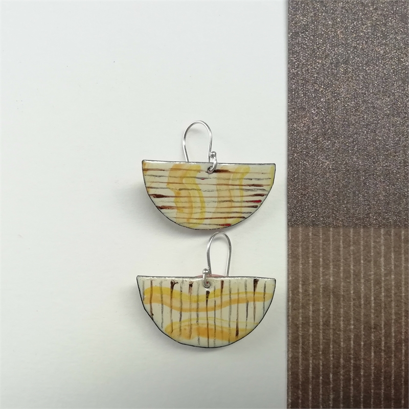 Pendientes de esmalte al fuego en tonos marfil, ocre y marrón. Forma de media esfera. Gancho de plata de Ley.